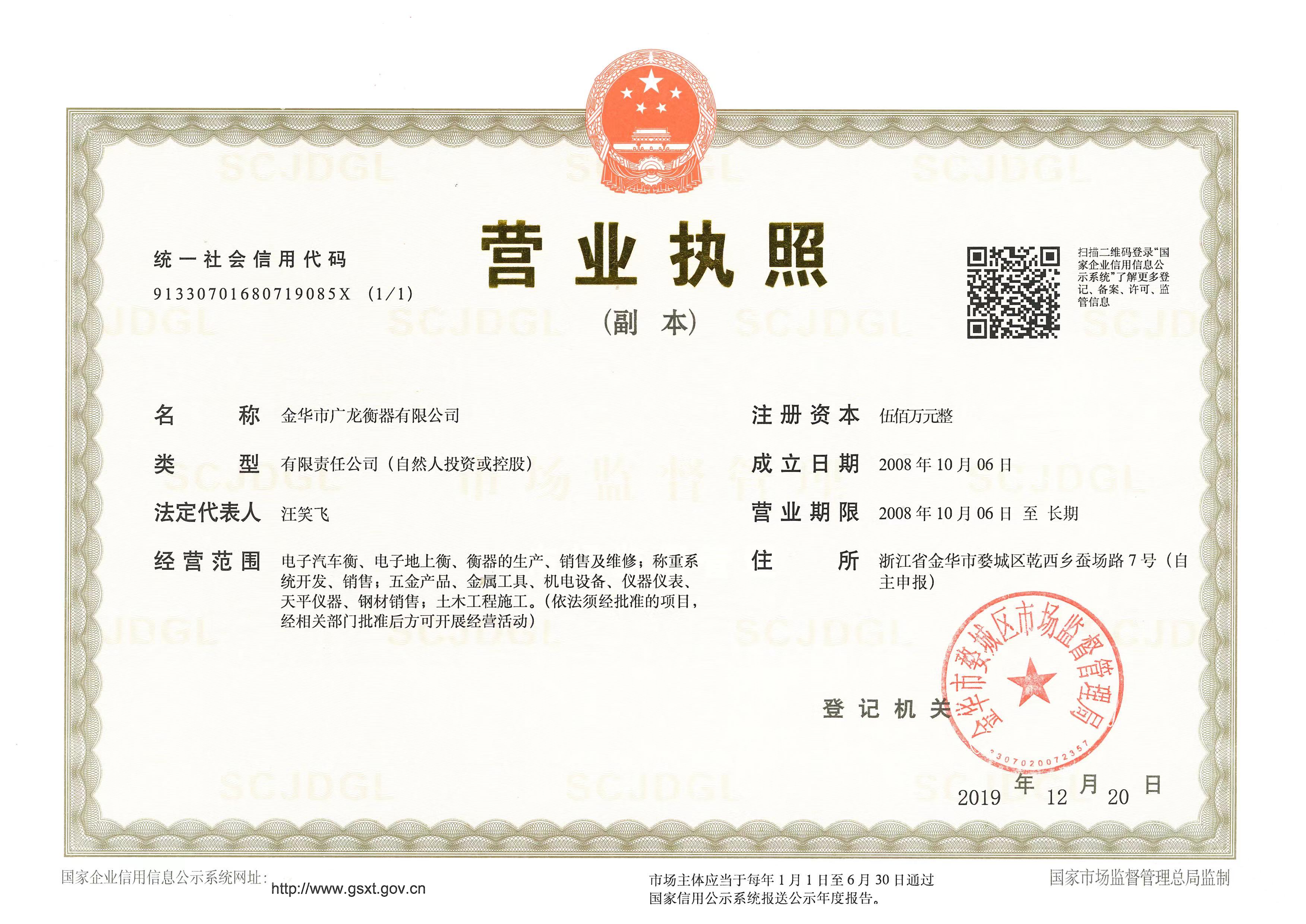 金華市廣龍衡器有限公司位于金華市經濟開發區內,是一家集科研、開發、制造及經營工業衡器的專業化企業。   公司憑借擁有一批高素質生產、銷售人員的優勢,全力打造高效率、快響應的運作團隊,致力服務于大眾.公司技術裝備精良、生產工藝先進,技術力量雄厚,嚴格按照國際標準體系的要求進行全面質量管理,生產并不斷創新研發各種全電子汽車衡、電子地上衡、電子臺秤、便攜式軸重秤、電子吊秤等產品。   公司堅持“以信為本、以質取勝”的宗旨,以“創新”為準繩,不斷提高產品質量。并且受到了廣大新老客戶的贊譽和高度信賴,為適應市場經濟發展的需求,實現品牌戰略,公司以優質的產品、良好的信譽、優惠的價格、真誠的服務竭誠歡迎廣大客戶來電洽談業務,攜手共創輝煌。
